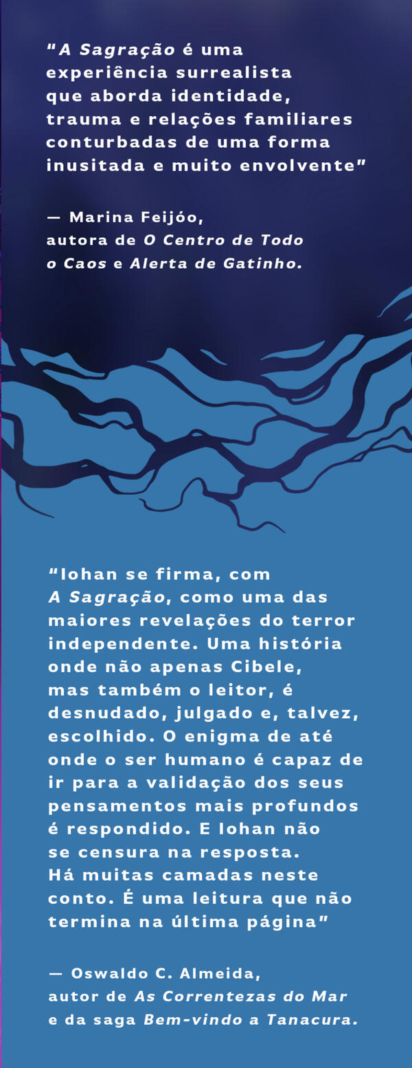Iohan V. Silva nasceu em 2000 na cidade de Jandira, onde reside, e cursa Letras na Universidade de São Paulo. Com foco em terror e suspense, costuma brincar com aspectos narrativos em suas histórias, experimentando sempre que possível. Eclético ao extremo, divide o tempo livre entre poesias, jogos e mídias diversas.